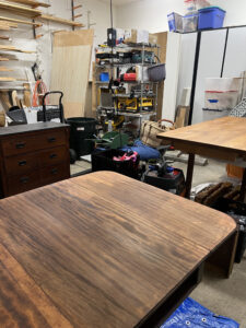 This is our garage, where I’ve got several projects in the works. No two pieces of furniture are ever the same and I’m not always thankful for the time involved, to bring them back to life. I often wonder how people can abuse a piece of furniture so badly. Anyway, it’s something you do because you enjoy the challenge, not the profits. I figure that I end up making about $1.15 per hour. 🙂 Thankfully, Mr.Wonderful is always there to help! Bless him!