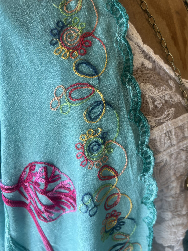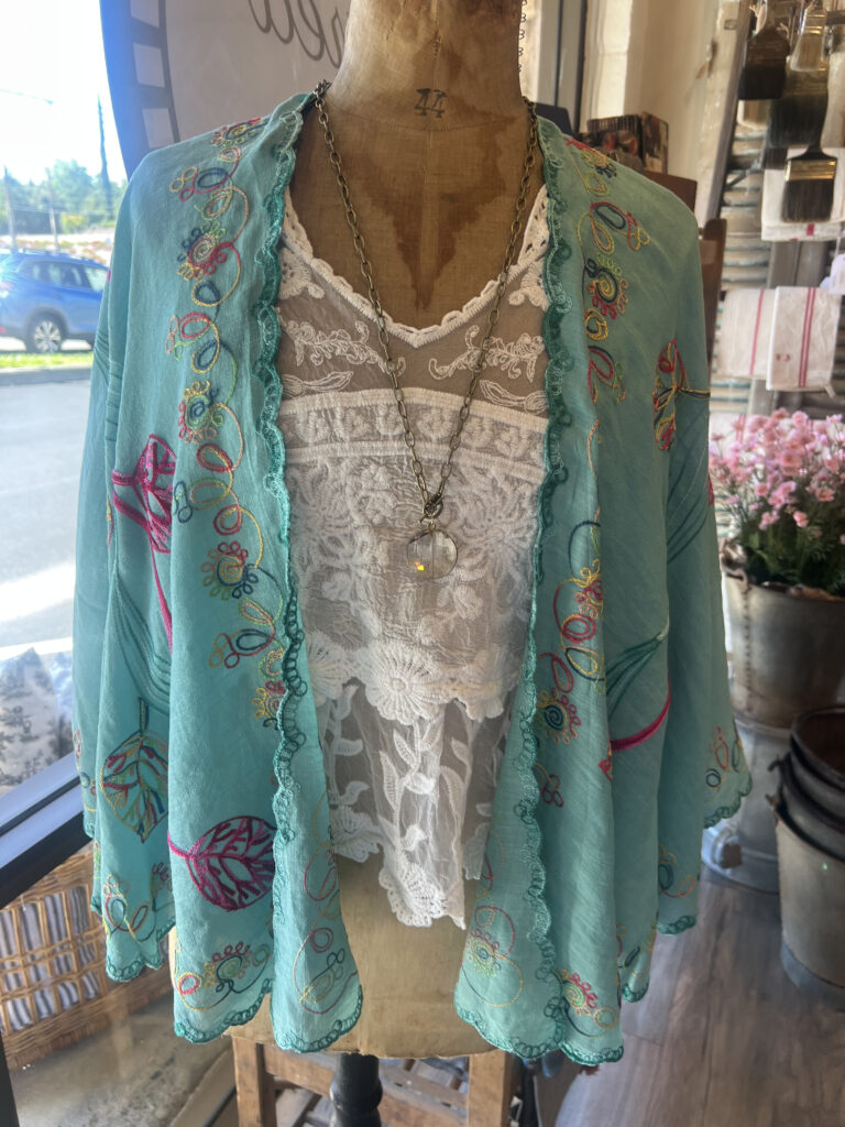 I love this combo! This embroidered wrap is in a gorgeous color and is perfect over this lacy top! $34.95 and $39.95, I believe.